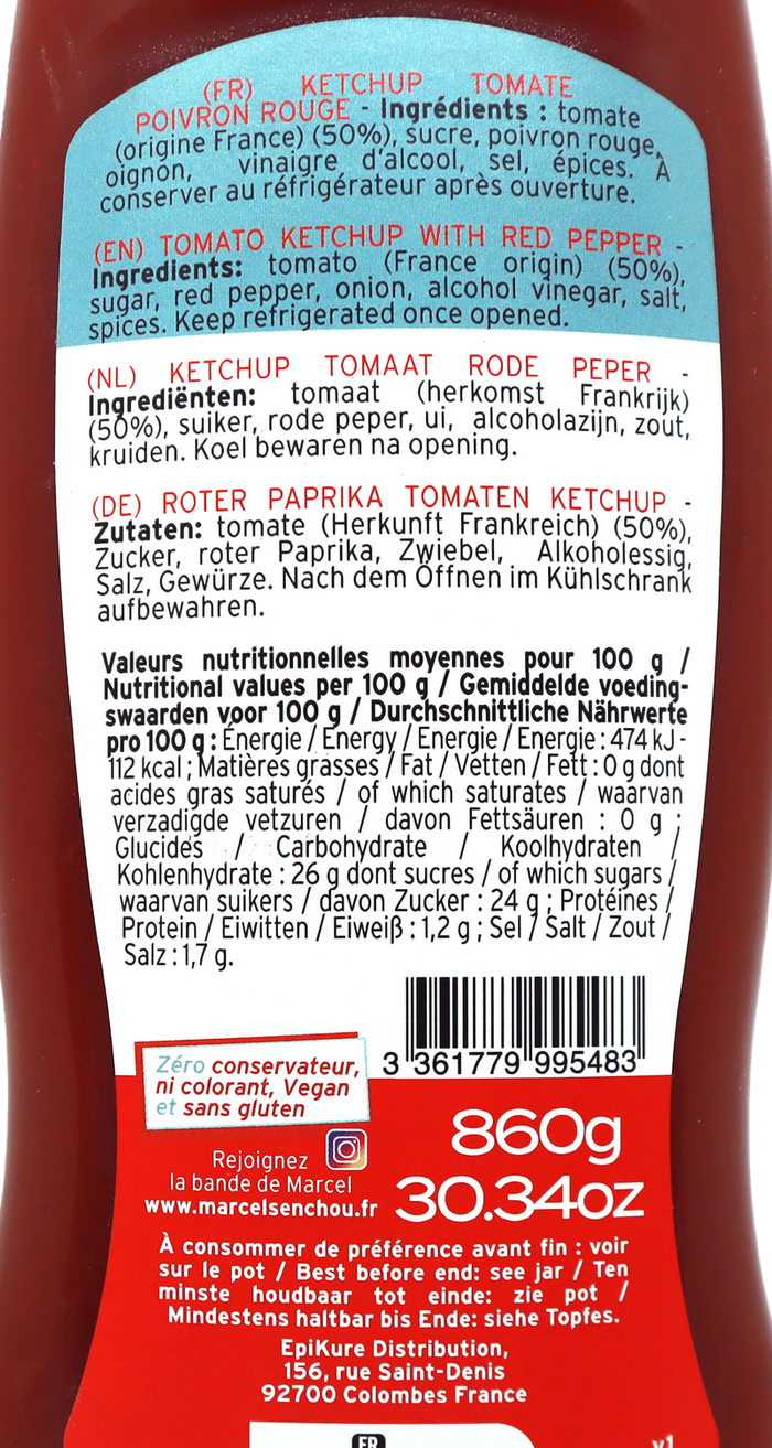 Pur Ketch’up tomate : Un Ketchup confectionné à base de tomates concassées, de l’oignon, poivron et des épices.