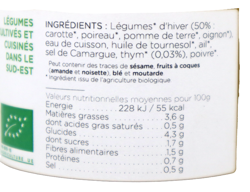 Légumes* d’hiver (51% : carotte*, poireau*, pomme de terre*, oignon*), eau de cuisson, huile d’olive* vierge extra, ail*, sel naturel de Camargue, poivre*, thym*