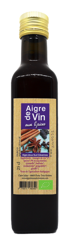 Ingrédients : vinaigre, cannelle, badiane, gingembre, girofle, fenouil, cardamome.