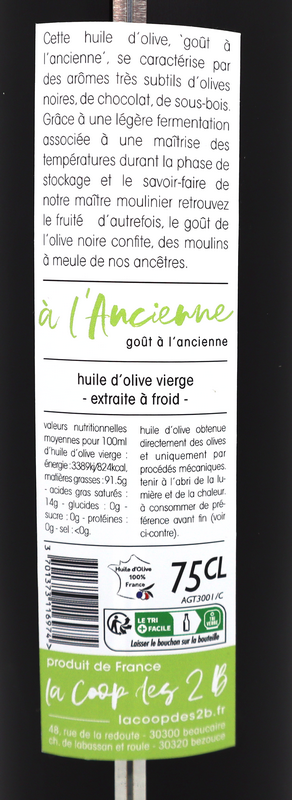 Cette huile d’olive ‘goût à l’ancienne’, se caractérise par des arômes très subtils d’olives noires, de chocolat, de sous-bois, de pain au levain.