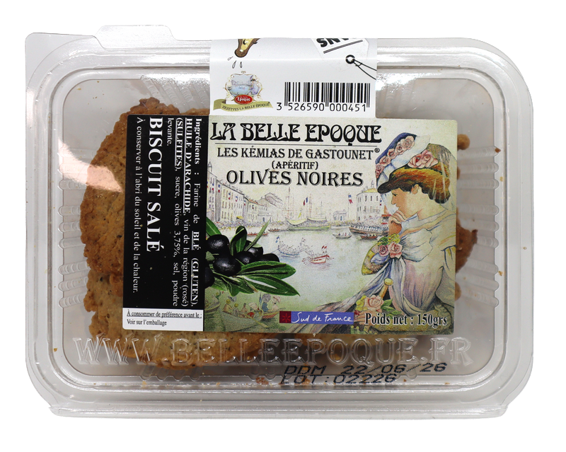 Les Kémias de Gastounet aux Olives Noires. Sablés dont les olives sont conditionnées à Frontignan, dans la même Zone Artisanale que la biscuiterie.