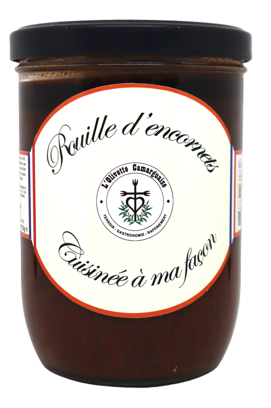 Notre rouille d'encornets s'inspire de la recette traditionnelle Sétoise. Les encornets sont mijotés lentement dans une sauce tomate au vin blanc légèrement relevée à laquelle j'ajoute une rasade de pastis pour lui conférer une note anisée.