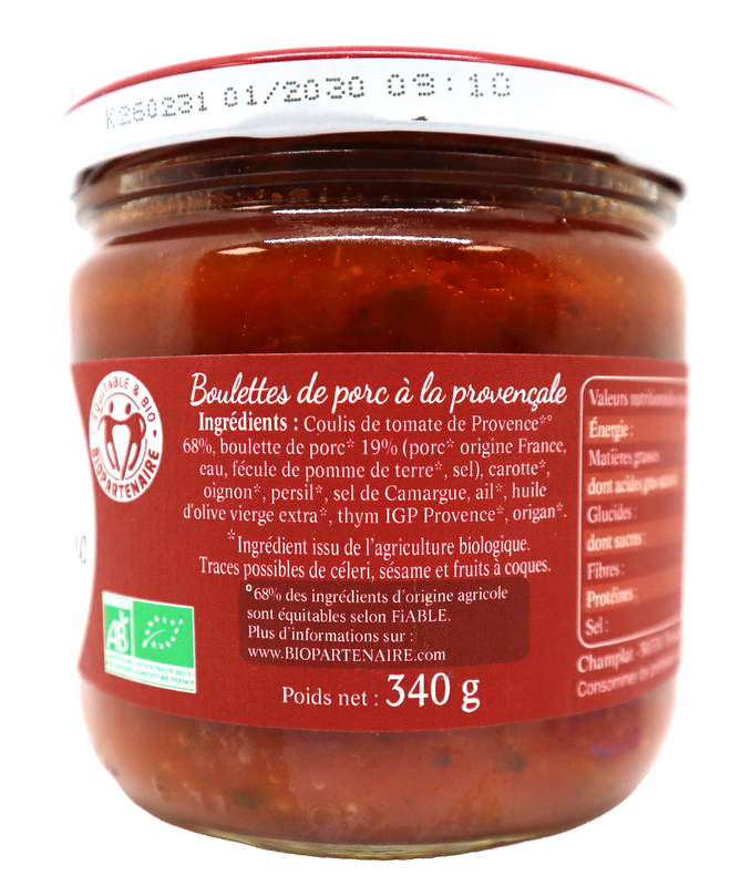 INGRÉDIENTS : Coulis de tomate de Provence*° 68%, boulette de porc* 19% (porc* origine France, eau, fécule de pomme de terre*, sel), carotte*, oignon*, persil*, sel de Camargue, ail*, huile d'olive vierge extra*, thym IGP Provence*, origan*. * ingrédient issu de l'agriculture biologique